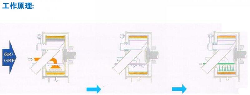 物料经进料管至选择的转鼓内,由料位探测器 控制n次脉冲进料,有限的加满转鼓。通常可达 到拦液板高度的75-80%。当滤饼达到预设高度 时,进料完成。 |